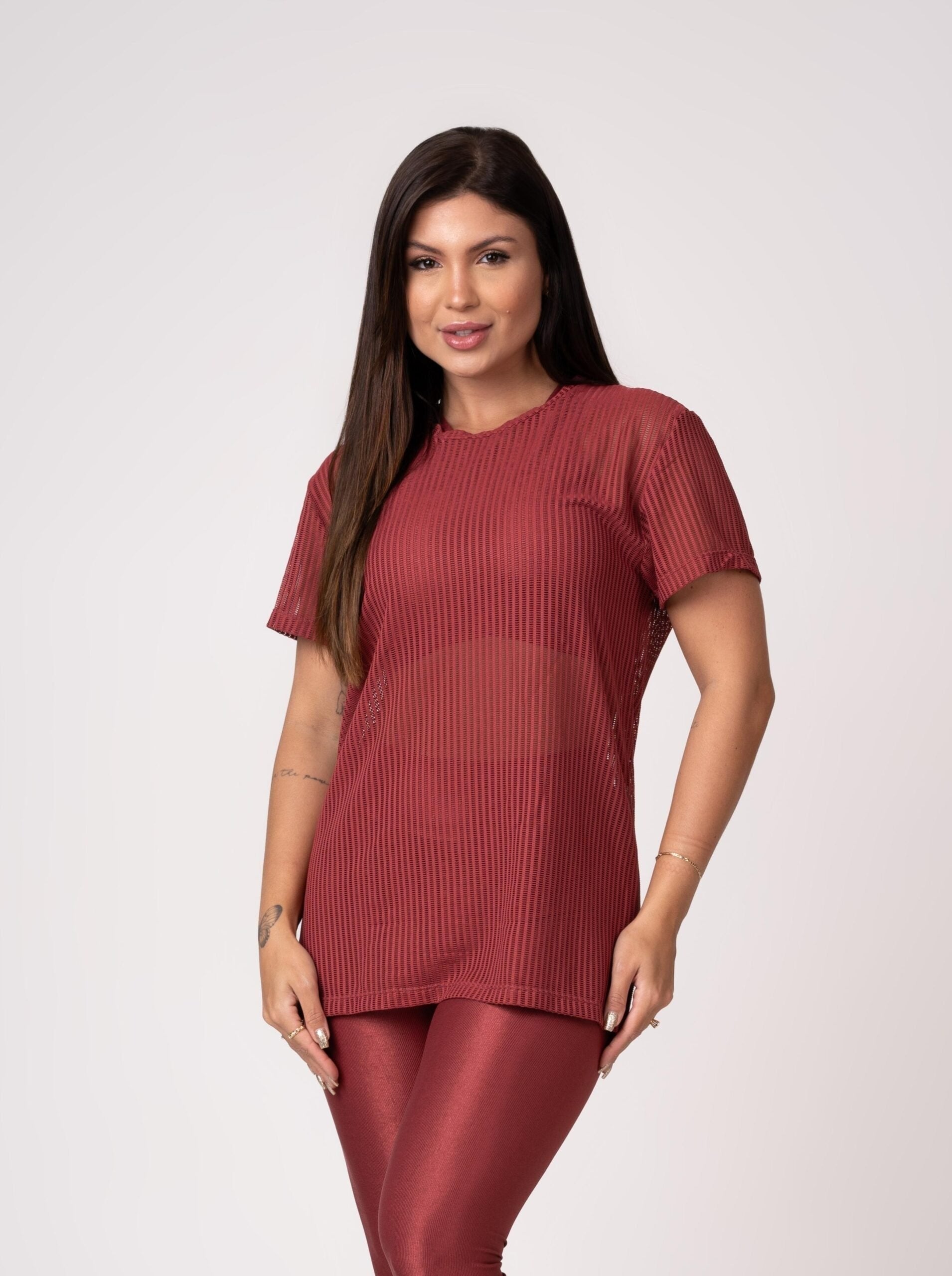 Todas as nossas peças fitness são confeccionadas com uma combinação de 90% poliamida e 10% elastano, materiais que garantem alta resistência, conforto e elasticidade para acompanhar todos os seus movimentos com liberdade e segurança. O tecido é leve, de toque macio, com rápida absorção e secagem, ideal para treinos intensos e uso diário.